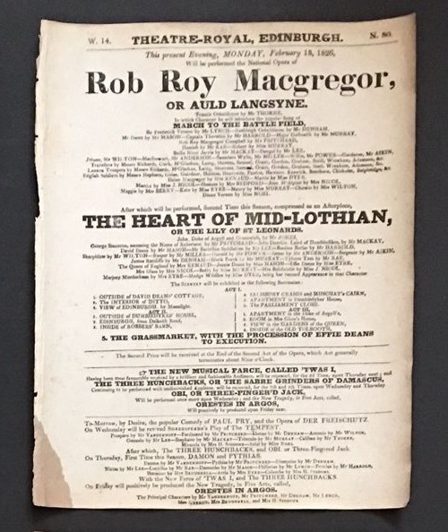 In 1819 Charles MacKay played the part of Baillie Nicol Jarvie in the first Edinburgh run of a play based on Scott’s novel Rob Roy. The Scots Magazine gave his performance a rave review, it ‘embodied to the eye and to the ear all the peculiarities which of right belong to a merchant – a magistrate – and member of the town-council in a Scottish corporation.’(4)